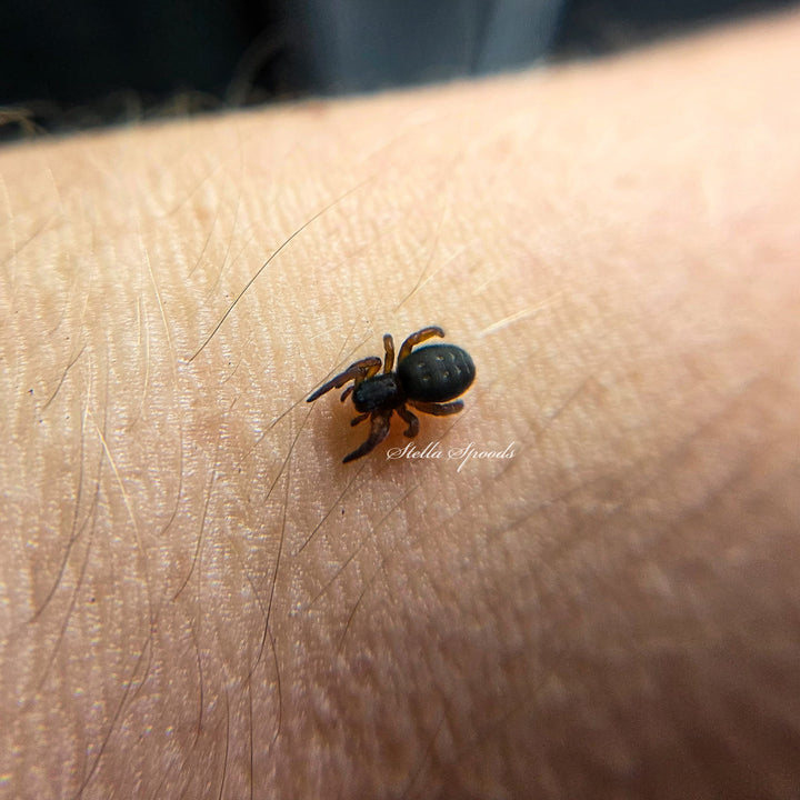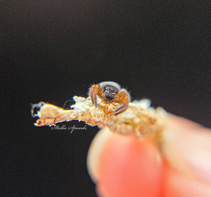 One of the cutest micro-species in the hobby! Gandanameno echinata is a South African velvet spider with a fuzzy black body, orange legs, and tiny size. Calm, web-building, and easy to keep—perfect for anyone who loves unique true spiders.